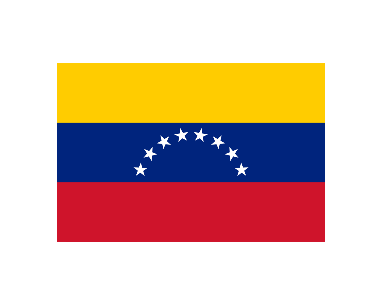 委內瑞拉玻利瓦爾共和國(Bolivarian Republic of Venezuela),簡稱委內瑞拉,是位于南美洲北部的國家,首都加拉加斯。委內瑞拉國旗啟用于1811年,國旗呈長方形,長寬之比為3:2。旗面自上而下由黃、藍、紅三個平行相等的橫長方形相連而成。旗面中央有八顆白色五角星,呈弧形排列;左上角繪有國徽圖案。黃、藍、紅三色來自原大哥倫比亞共和國國旗顏色,黃色代表豐富的資源,藍色代表天空和大海,紅色代表獨立戰爭中犧牲的戰士的鮮血。七顆五角星代表1811年委內瑞拉聯邦的七個省。政府機構使用帶國徽的國旗,民間使用了不帶國徽的國旗。在時任總統查韋斯的推動下,2006年3月7日,委內瑞拉國民議會通過了對國旗和國徽的修改意見,決定把國旗上7顆星增加為8顆。新增加的一顆星代表1817年擺脫西班牙統治、并入委內瑞拉的圭亞那省。