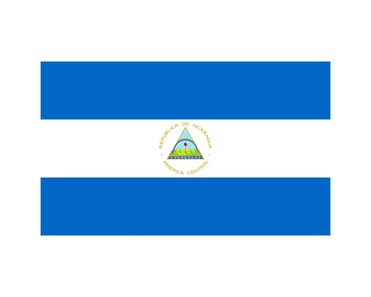 尼加拉瓜共和國(英語:The Republic of Nicaragua),簡稱尼加拉瓜,是一個總統共和制的國家,位于中美洲中部,首都為馬那瓜。尼加拉瓜國旗啟用于1971年8月27日,國旗呈長方形,長寬之比為5:3。旗面自上而下由藍白藍三個平行相等的長方形組成。中央繪有國徽。國旗顏色來源自原中美洲聯邦國旗,也象征這個國家在太平洋和加勒比海之間的地理位置。