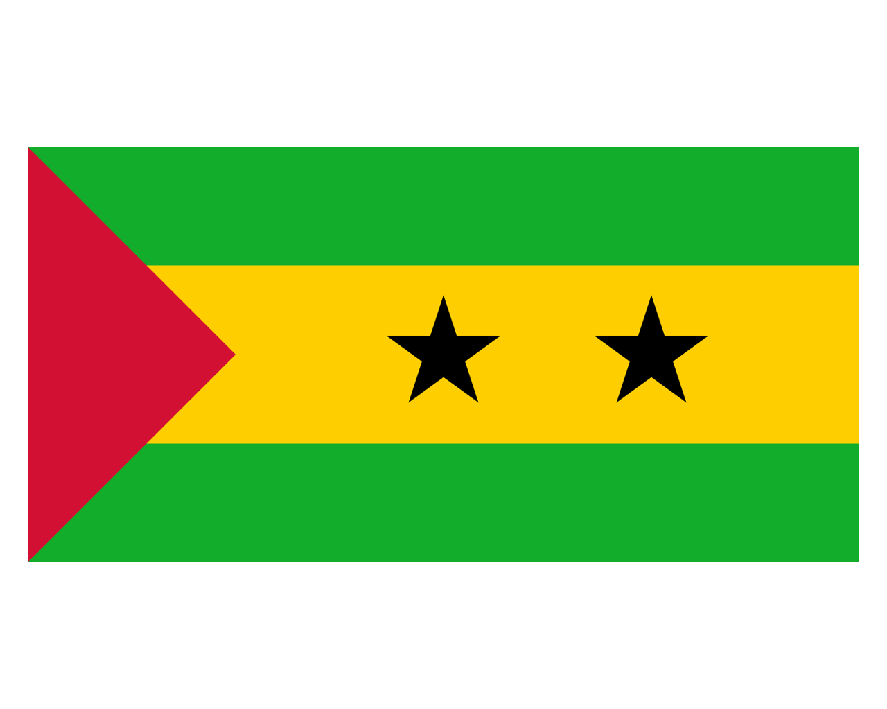 圣多美和普林西比民主共和國簡稱圣多美和普林西比。是位于非洲中西側幾內亞灣東南部的島國,首都是圣多美。圣多美和普林西比國旗呈橫長方形,長與寬之比為2:1。由紅、綠、黃、黑四色構成。靠旗桿一側為紅色等腰三角形,右側為三個平行寬條,中間為黃色,上下為綠色,黃色寬條中有兩顆黑色五角星。綠色象征農業,黃色象征可可豆和其他自然資源,紅色象征為獨立自由而斗爭戰士的鮮血,兩個五角星代表圣多美、普林西比兩個大島,黑色象征黑人。