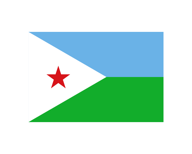 吉布提共和國(guó)(The Republic of Djibouti),簡(jiǎn)稱(chēng)吉布提,地處非洲東北部亞丁灣西岸,首都吉布提市。吉布提國(guó)旗呈長(zhǎng)方形,長(zhǎng)與寬之比約為9∶5。靠旗桿一側(cè)為一個(gè)白色等邊三角形,邊長(zhǎng)與旗寬相等;右側(cè)為兩個(gè)相等的直角梯形,上方為天藍(lán)色,下方為綠色。白色三角形正中有一顆紅色五角星。天藍(lán)色代表海洋和天空,綠色象征土地和希望,白色象征和平,紅五角星代表人民的希望和斗爭(zhēng)的方向。整個(gè)國(guó)旗圖案的中心思想是“團(tuán)結(jié)、平等、和平”。