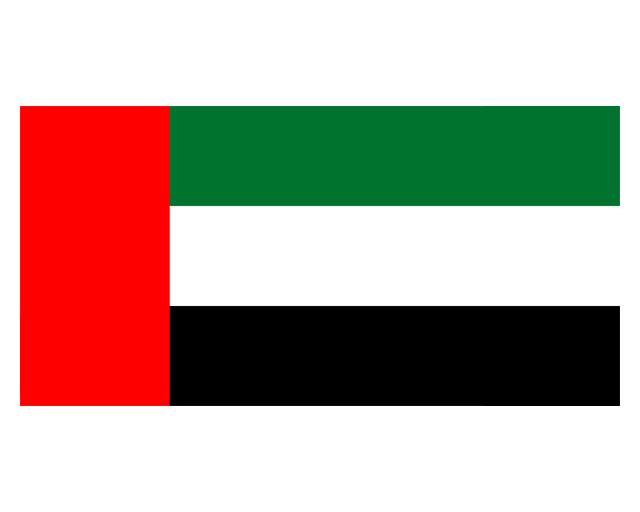 阿拉伯聯合酋長國,簡稱“阿聯酋”,是位于亞洲西南部阿拉伯半島東部的西亞國家。阿拉伯聯合酋長國國旗呈長方形,長與寬之比為2比1。由紅、綠、白、黑四色組成,這四色是泛阿拉伯顏色,代表穆罕默德后代的幾個王朝。旗面靠旗桿一側為紅色豎長方形,右側是三個平行相等的橫長方形,自上而下分別為綠、白、黑三色。紅色象征祖國,綠色象征牧場,白色象征祖國的成就,黑色象征戰斗。