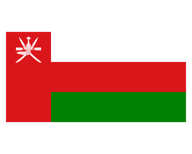 阿曼蘇丹國(Sultanate of Oman),簡稱阿曼,是位于西亞,阿拉伯半島東南沿海的一個國家。阿曼國旗為長方形,長寬之比為2:1。旗面由紅白綠組成。紅色部分在旗面上形成橫的“T”字圖案。旗面的右側(cè)上,下分別為白,綠色長方形,中間被紅色寬條隔開。左上方繪有國徽圖案。紅色象征吉祥,白色象征和平與純潔,綠色象征大地。左邊的紅帶上印有國徽。