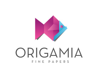 Origamia紙文化創意標志設計欣賞,非常有創意的一個幾何標志設計,使用紙質層疊出動物“魚”的形狀,整體以紫色和藍色作為主識別色。