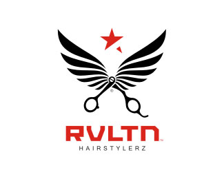 RVLTN發(fā)型工作室創(chuàng)意標(biāo)志設(shè)計(jì),融入星星、剪刀、翅膀等元素組合而成的主識(shí)別圖形,整體以紅色加黑色的色彩組合。