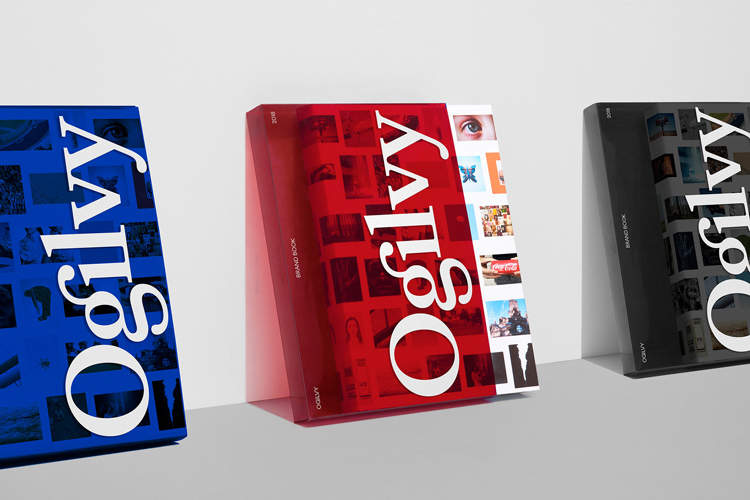這是一個(gè)新的定制的無(wú)襯線字體,叫做Ogilvy Sans,一個(gè)更新品牌色體系包括深藍(lán)色、灰綠色、粉紅色和灰色。