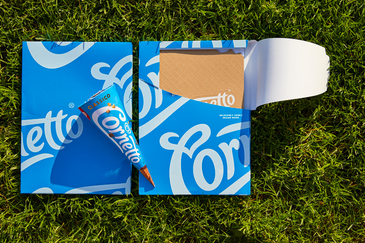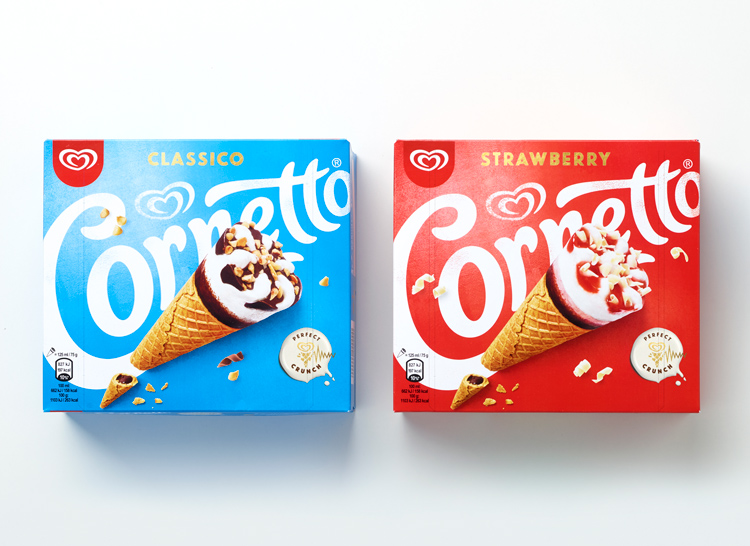 冰淇淋品牌Cornetto新商標設計簡化”現有版本的logo字體,設置為白色。之前的棕色背景被去掉了,字體也被改良,logo現在有了絲網印刷的效果,logo和包裝上出現了褪色的部分。