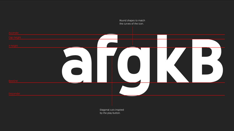 字體的形式受到play按鈕符號的啟發(fā),一些字母上的圓形邊緣是基于彎曲的紅色外方框,對角線上的切割反映了中間的白色三角形。